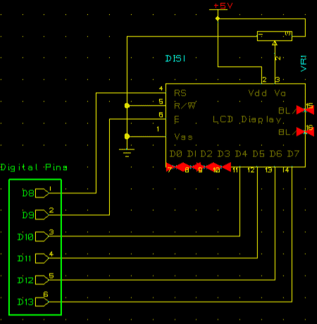 Figure below shows the schematic of the LCD. Digital pin 8 – 13 was reserved for the LCD as shown in the Schematic. Pin 1 and Pin 3 are the power and ground whereas pin 2 is the contrast pin on the LCD which controls the contrast and connected with the potentiometer. It must be kept in mind while connecting LCD is that digital pins from Arduino and data pins from LCD has to be connected in correct order otherwise LCD will display only garbage on the screen.