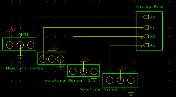 Figure below shows the schematic of the Sensor circuit. As all the sensor connected with the Arduino analogue pin A0-A3. Pin A0 was reserved for the temperature and humidity sensor whereas pins A1-A3 were reserved for moisture sensors. All the sensors have common power 5V and Ground as shown in the schematic.