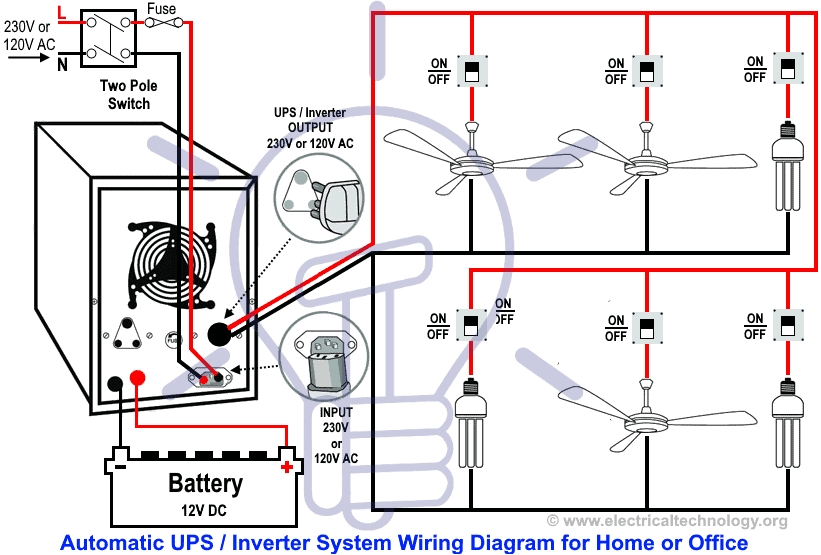 Did you read this Post.<br />Automatic UPS System Wiring Diagram in Case of some items depends on UPS and rest depends on Main Power at Office or Home.<br />https://www.electricaltechnology.org/2012/11/automatic-ups-system-wiring-diagram-in.html