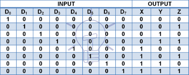 The truth table for 8 to 3 line encoder is given below: