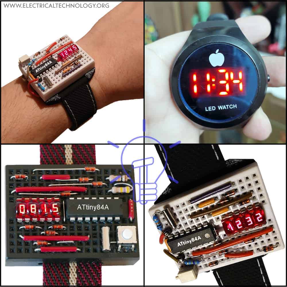 A breadboard LED wristwatch is an innovative electronic gadget and DIY project for enthusiasts. The watch is based on an ATtiny84A microcontroller and a few electronic components, and it is designed to display the time in hours and minutes on a bubble 7-segment LED display. For a beautiful look, you may use a fancy case with dimensions of approximately 37x23x3.5mm.