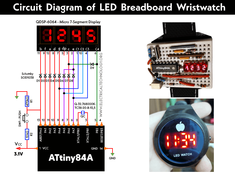 Circuit Diagram of LED Breadboard Wristwatch Using ATtiny84A