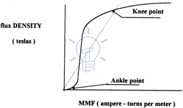 For this CT to operate satisfactorily at maximum fault currents, it must operate on the linear part of the magnetizing curve, i.e., below the point at which saturation occurs, which is known as the knee point.