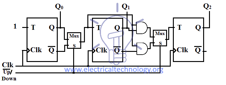 We combine up & down counter of T-flip flop into one counter. We used 2_1 Mux for the inputs on each flip-flop except the first one.