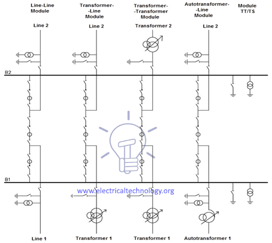 - Double busbar, with or without “bus coupling bay”.