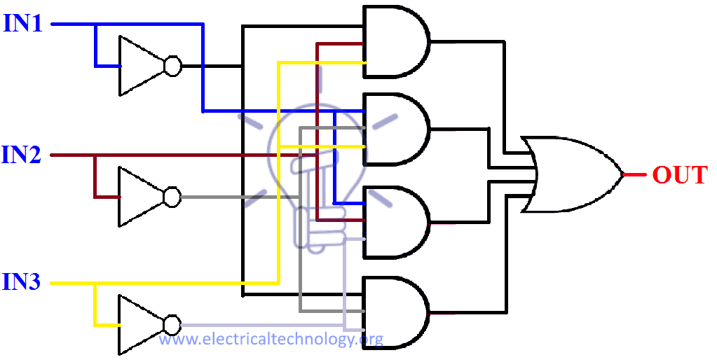 OUT = (I̅N̅1̅ & I̅N̅2̅ & I̅N̅3̅) + (I̅N̅1̅ & IN2 & IN3) + (IN1 & I̅N̅2̅ & IN3) + (IN1 & IN2 & I̅N̅3̅)