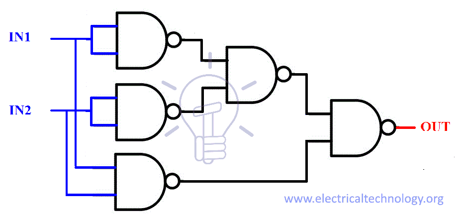 OUT = [ { (IN1 + IN1)’+ IN2}’ + { IN1 + (IN2 + IN2) }’ ]’ (IN1 + IN1)’ = I̅N̅1̅