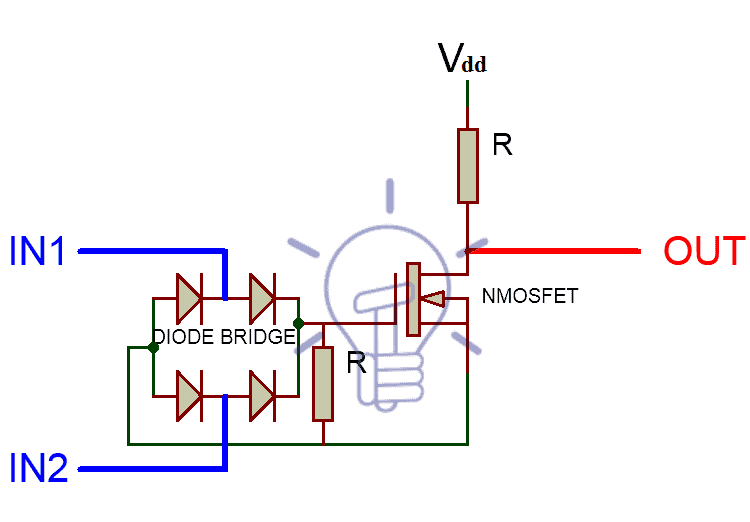 In this schematic 4 diodes are used in a bridge configuration for sorting out input logic. NMOSFET is used for switching upon input logic. The resistor between Diode Bridge and MOSFET is used in parallel configuration because MOSFETs operates on Gate’s voltages, not current.