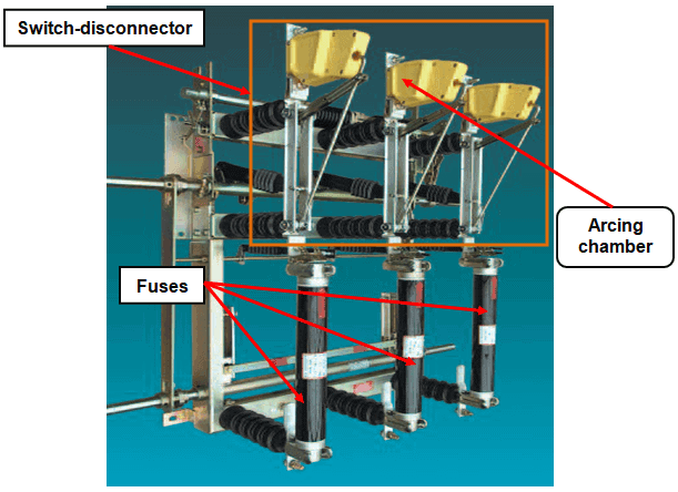 Switch-disconnectors may be mechanical (lever or crank) or motor operated (local or remote) and provided with earthing switches, mechanically interlocked, and release coils; some utilities used them associated with fuses for the protection of MV/LV[3] distribution power transformers (usually with rated power up to 630 kVA), as represented in Figure 2.