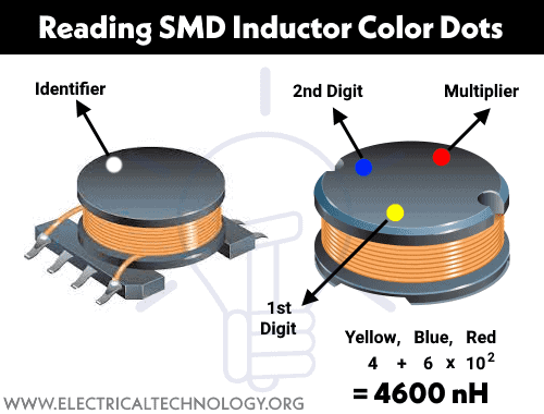 On SMD inductors, there is no possibility to print the inducting marking or color code bands due to the small surface area of the tiny component. This way, only colored dots are printed on these inductors to represent the value of inductance in nanohenries. Keep in mind that these dots do not represent the polarity of the inductors and can only be used in clockwise direction to determine the value of SMD inductors.