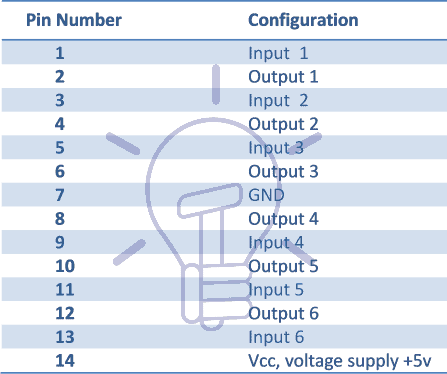 Commonly used NOT gate DIP (dual in-line package) IC is 7404 (7404 Hex Inverter NOT Gate) having 6 discrete NOT gates operating on TTL voltages. It has 14 pins and its configuration is given below.