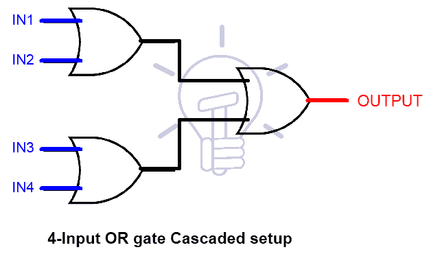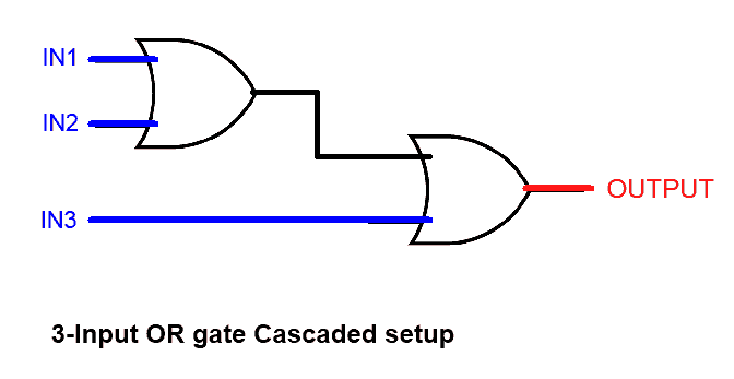Multi-input OR gate can be made from cascading setup of 2-input OR gates as shown in the figure given below.