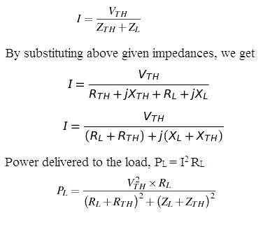 Therefore, in AC circuits, if XL = – XTH and RL = RTH, maximum power transfer takes place from source to load. This implies that maximum power transfer occurs when the impedance of the load is complex conjugate of the source impedance, i.e., ZL = Z*TH