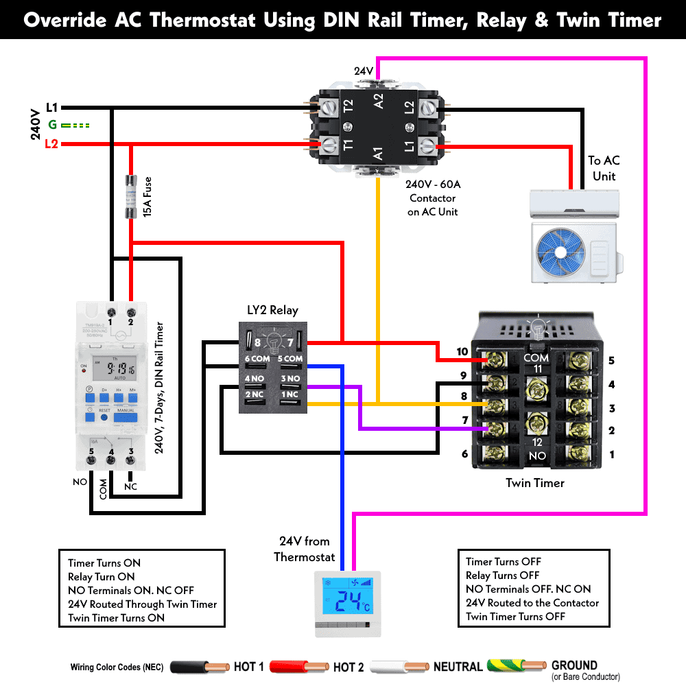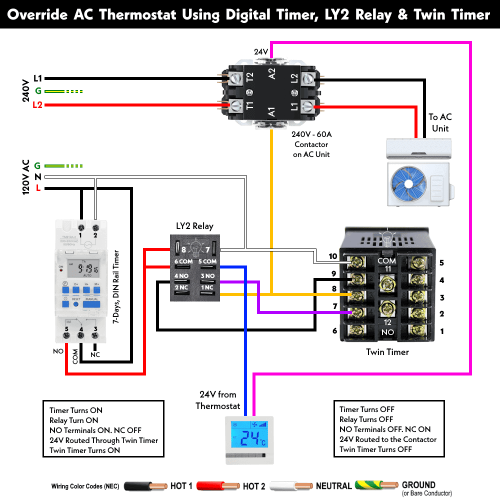 When the timer is ON, it activates the relay. Consequently, the 24V thermostat disconnects from the contactor and is redirected to the twin timer.