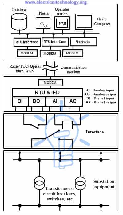 The above figure shows the typical SCADA based substation control system. Various input/output (I/O) modules connected to the substation equipment gathers the field parameters data, including status of switches, circuit breakers, transformers, capacitors and batteries, voltage and current magnitudes, etc. RTUs collect I/O data and transfers to remote master unit via network interface modules.