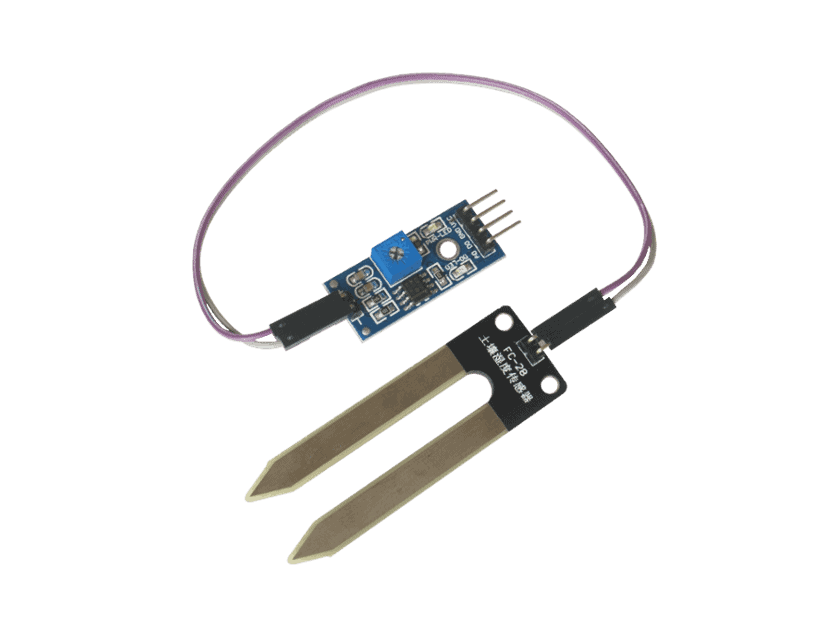 There are two probes in the soil moisture sensor which is used to measure the volumetric content of water in soil. These two probes allow the current to pass through the soil and then it gets the moisture value present in the soil.
