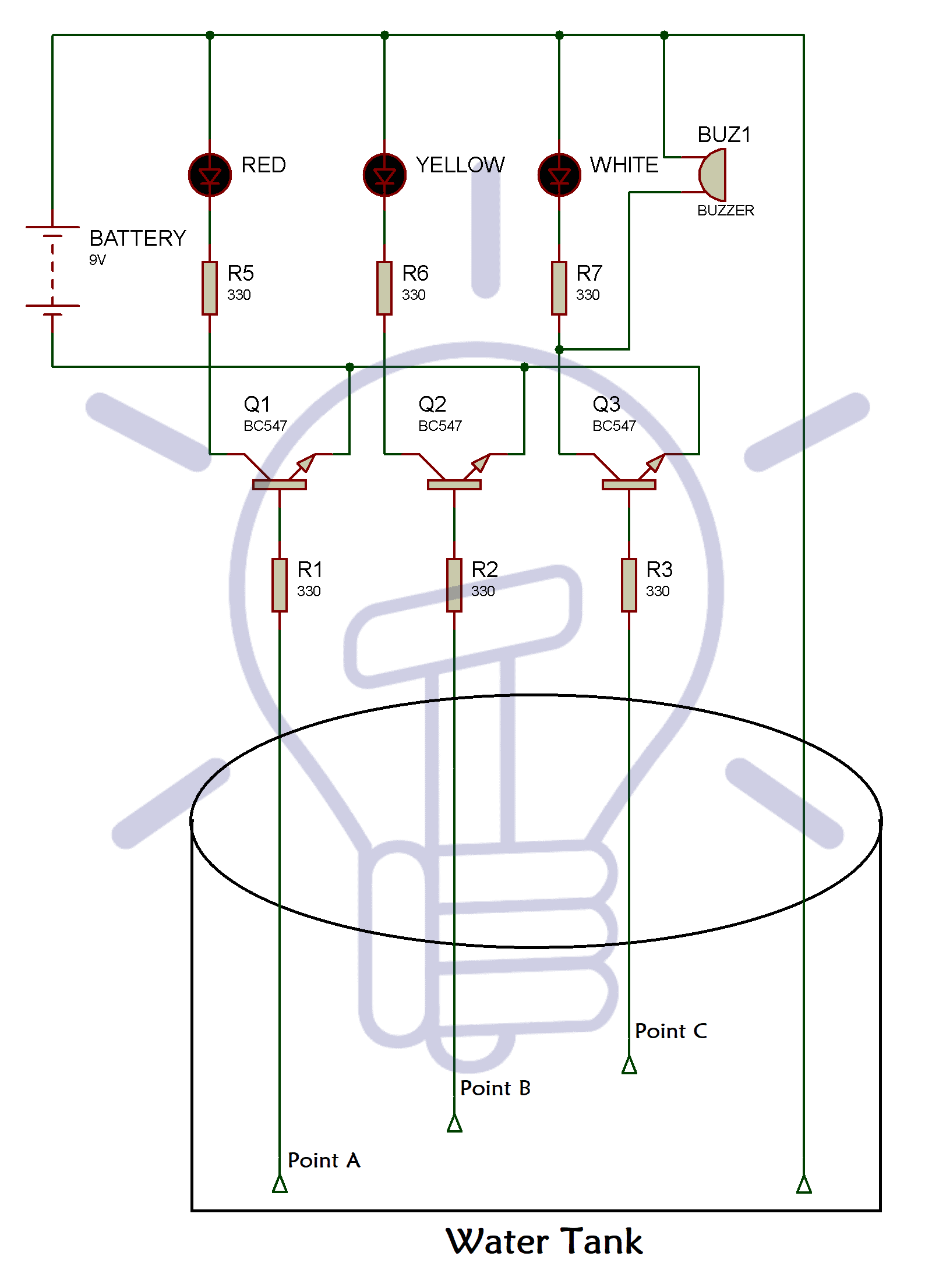 BC 547 is an NPN bipolar junction transistor that is used to amplify current to a certain level. Here, we have used BC 547 as a Switch. We have created three different levels of water level detection namely A, B, and C. We have connected LEDs at three points to indicate particular water level along with a buzzer to indicate the full level of the tank. Whenever water level reaches point A, transistor Q1 is turned ON and Red LED starts glowing. When the level of water reaches to point Transistor Q2 is turned ON and the yellow LED starts glowing. Similarly, when the water level reaches to point C, Transistor Q3 is turned ON which triggers the White LED and the buzzer starts beeping indicating that tank is full, you can turn off the water pump. We can create different levels of water detection using more colored LEDs and transistors to sense the desired level of water in the tank.